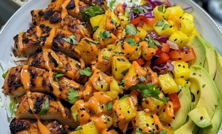 Questo piatto di pollo al limone e zenzero con salsa di ananas e mango è un'esplosione di sapori freschi, agrumati e tropicali! Succosi bocconcini di pollo ricoperti da una glassa al limone e zenzero, serviti su cremoso riso al cocco, conditi con una vivace salsa di ananas e mango e guarnita con un filo di maionese piccante. È il mix perfetto di dolce, aspro e piccante! 🌞✨