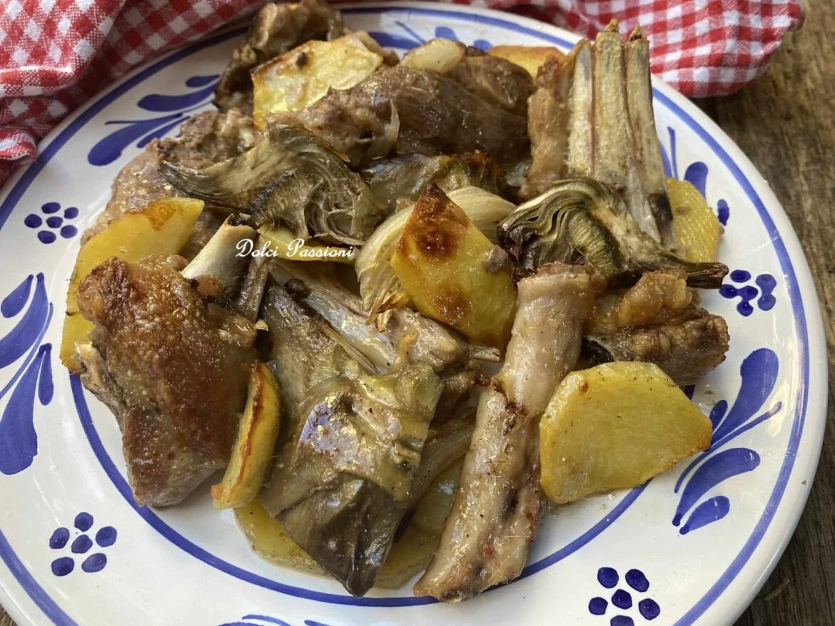 La carne, tenera e succosa, viene cotta lentamente in forno fino a diventare morbida e saporita, avvolta dai profumi intensi dei carciofi e dalla doratura irresistibile delle patate.