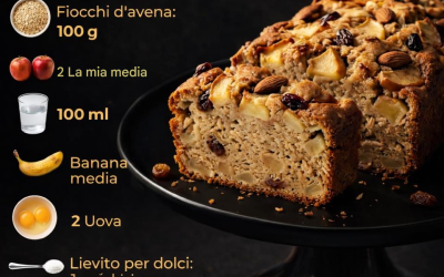 Ingredienti Fiocchi d’avena: 100 g Mele medie: 2 Acqua: 100 ml Banana media: 1 Uova: 2 Lievito per dolci: 1 cucchiaino Mandorle: 70 g Uvetta: 50 g Preparazione Metti i…