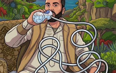 A mio parere, l’uomo sta bevendo acqua. Osservando il labirinto di tubi, notiamo che il tubo collegato alla bottiglia che…