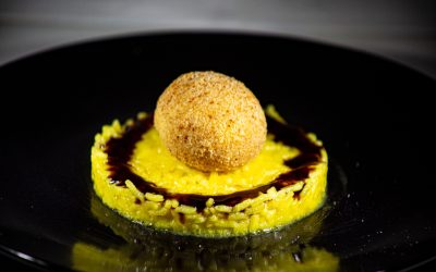 Uovo alla Milanese su Riso alla Milanese con Riduzione di Glassa di Aceto Balsamico di Modena
