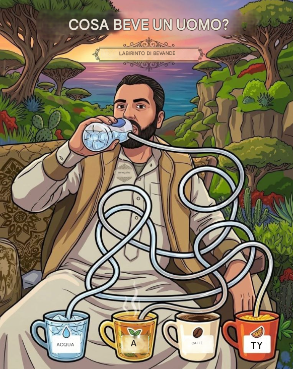 A mio parere, l’uomo sta bevendo acqua. Osservando il labirinto di tubi, notiamo che il tubo collegato alla bottiglia che tiene in mano conduce infine a una tazza con la scritta « ACQUA ». Sebbene i tubi appaiano molto complessi e si intersechino più volte, il percorso parte dalla bottiglia e prosegue lungo le curve fino alla tazza d’acqua.