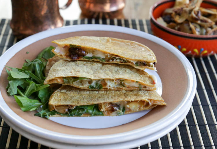 Quesadillas vegetariane sostanziose ripiene di formaggio pepper jack e cuori di carciofo arrostiti marinati al chipotle. I carciofi arrostiti al chipotle sono un ottimo antipasto anche da soli!