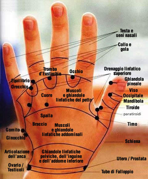 La digitopressione agisce direttamente sui muscoli: effettuando una pressione sui punti adeguati può trattare varie condizioni. Nell’immagine trovi tutti i punti di pressione del palmo della mano. Effettua una pressione delicata e in senso circolare, usando le dita, per circa 2 minuti per ciascuna delle mani.