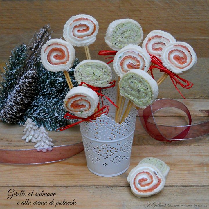 Le girelle al salmone o alla crema di pistacchi sono antipasti veloci e sfiziosi ideali per i menù delle feste.