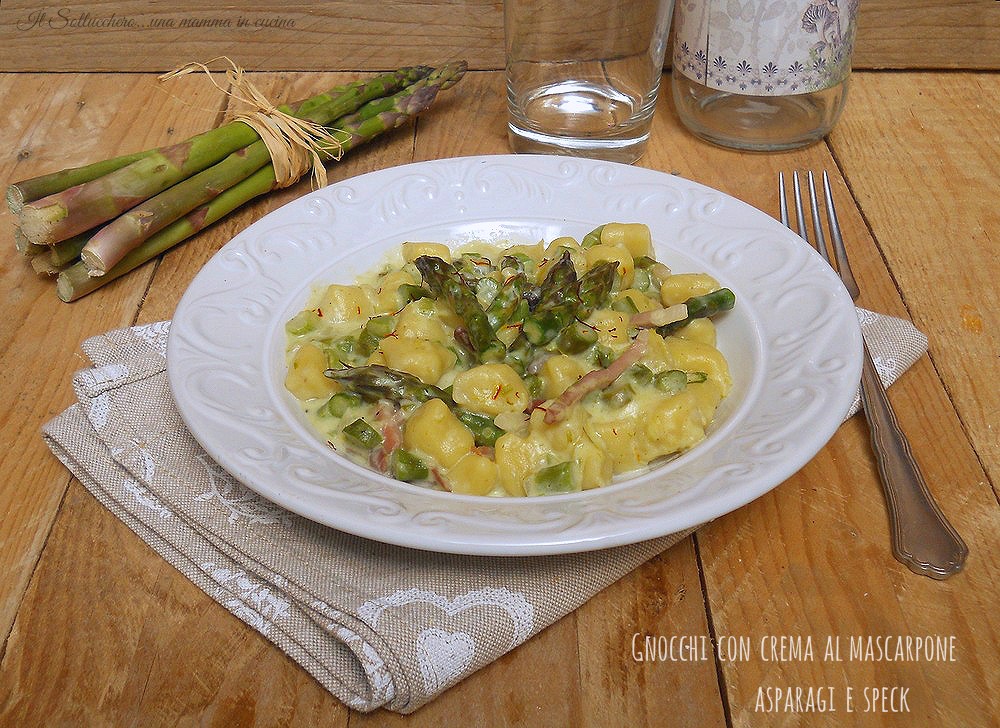 Gli gnocchi con crema al mascarpone, asparagi e speck sono golosissimi, saporiti e sicuramente, non poco calorici. Sono un piatto unico al quale possiamo abbinare una bella macedonia di frutta e realizzare un pranzo della domenica diverso dal solito.