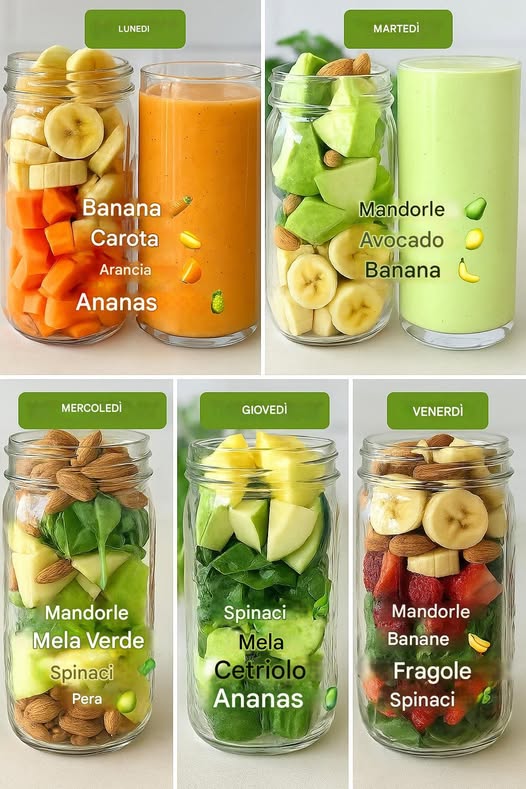 Cerchi un’idea per rendere le tue giornate più sane e deliziose? Questo piano settimanale di frullati è la risposta perfetta. Ogni giorno un gusto nuovo, con ingredienti naturali che favoriscono energia, digestione, idratazione o semplicemente offrono una pausa gustosa. Puoi personalizzare ogni ricetta in base alle tue esigenze e gusti.