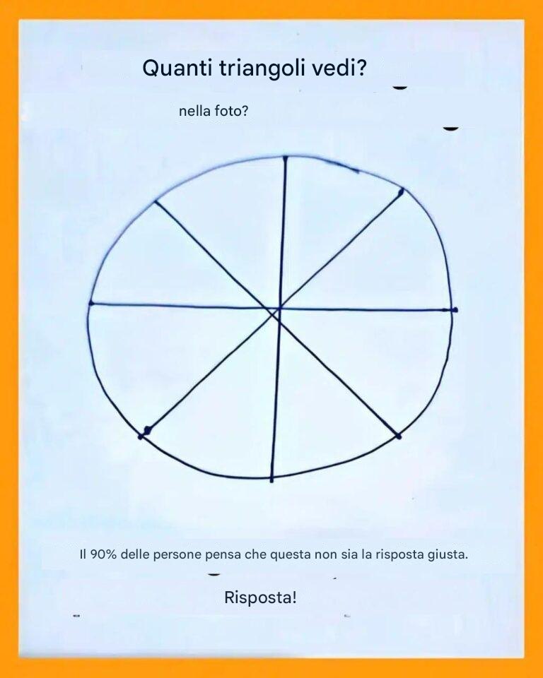 Sembra una torta tagliata simmetricamente. Un cerchio, quattro linee rette che si intersecano al centro e una semplice domanda scritta a mano: "Quanti triangoli?" "Facile, vero? Eppure..." Questo piccolo rompicapo visivo, che sta circolando sui social media, mette alla prova anche le menti più attente. Siete pronti alla sfida?