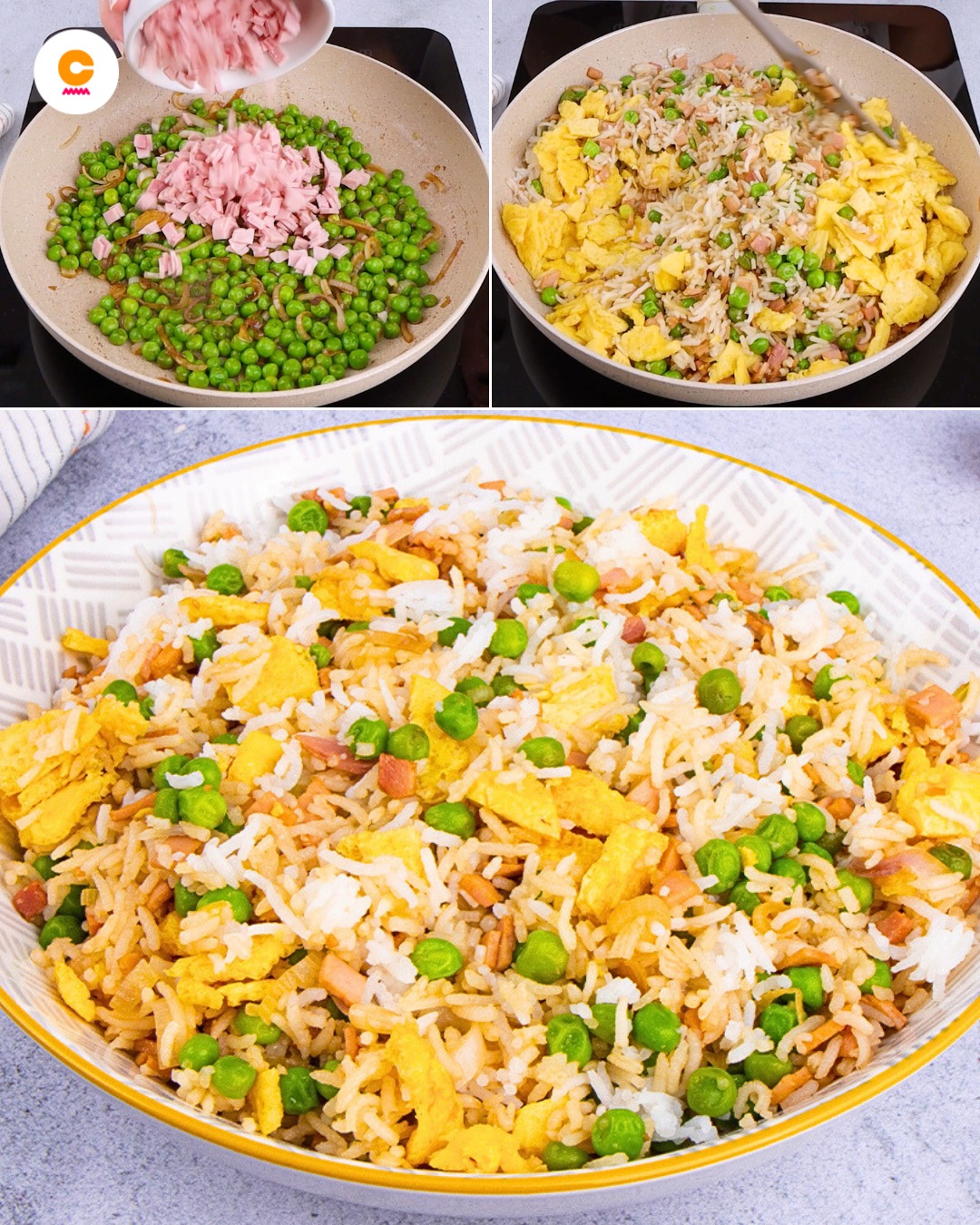 Cuoci il riso in abbondante acqua salata, scolalo al dente e lascialo raffreddare su un vassoio. Per un risultato ottimale, puoi stenderlo su una teglia e farlo asciugare qualche minuto: questo passaggio evita che in padella diventi troppo umido.