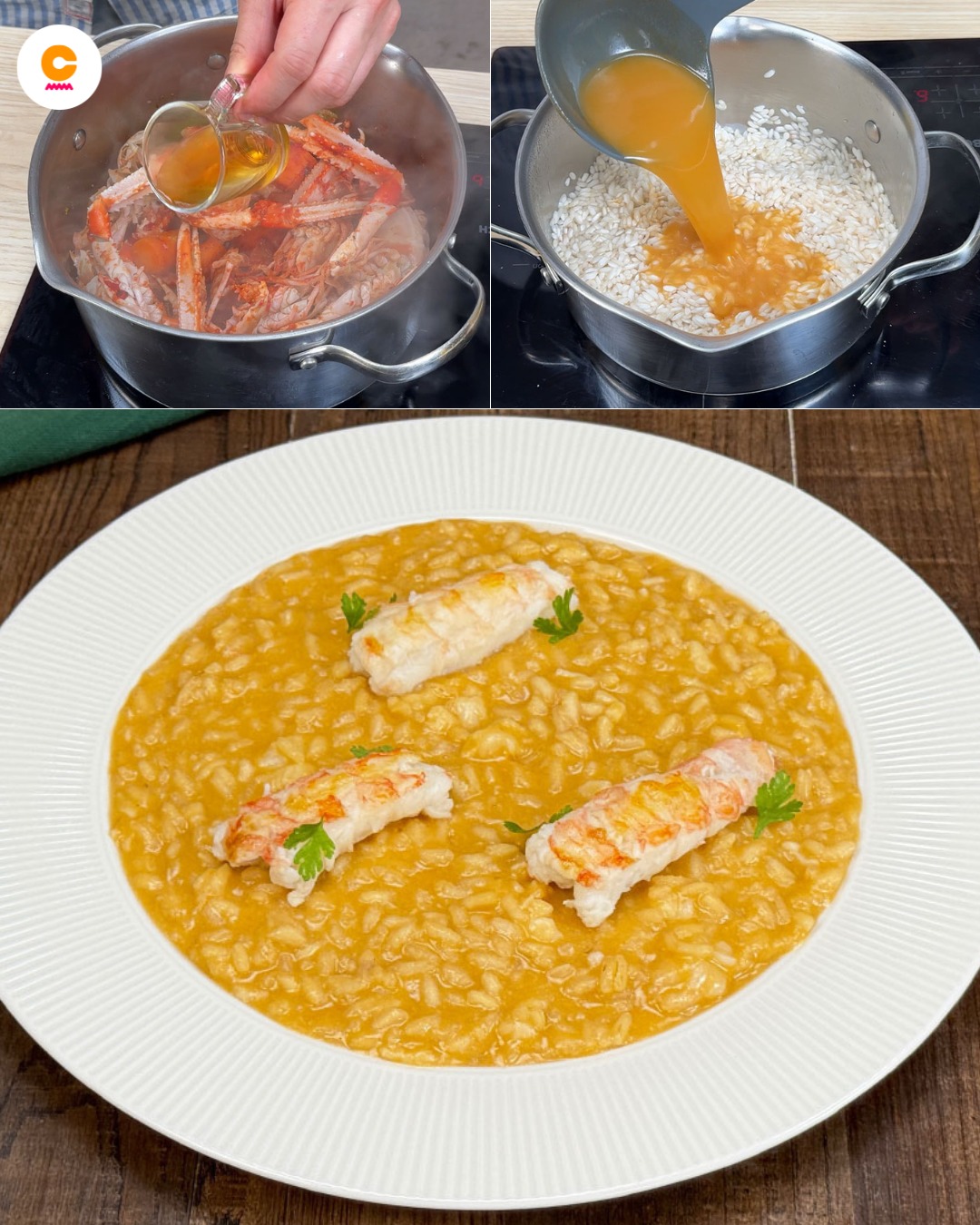 Il nostro Michele Ghedini ha mantecato il risotto lontano dai fornelli con il burro freddo a cubetti, un goccino di aceto e la polpa degli scampi cruda tritata al coltello e ha completato poi il tutto, per un risultato ancor più elegante e scenografico, con 3 crostacei interi scottati sul fuoco.