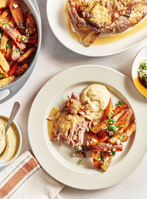 Preparata per la trasmissione "La cuisine d'Isabelle et Ricardo", questa ricetta dello chef Arnaud Marchand esalta gli ingredienti locali in un piatto perfetto per intrattenere gli ospiti. La spalla di agnello viene preparata con largo anticipo, passandola in forno a bassa temperatura per 12 ore, per ottenere una carne eccezionalmente tenera. Viene servita con uno stufato di radici e una salsa al prezzemolo e aglio che aggiunge un tocco di freschezza al piatto.