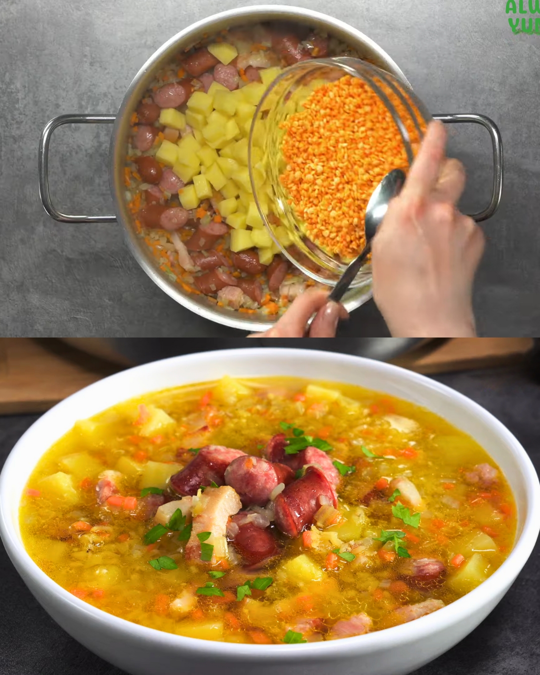 Questa sostanziosa zuppa di lenticchie unisce i sapori intensi della salsiccia affumicata, della pancetta e delle verdure con le tenere lenticchie rosse per creare un pasto confortante e appagante. Arricchita con un tocco di aceto di mele e condita con foglie di alloro e pepe nero, questa zuppa è perfetta per un pranzo o una cena caldi. Facile da preparare e ricca di sapori intensi, è un piatto che vi riscalderà nelle giornate fredde. Servitela con un pizzico di erbe aromatiche fresche per un pasto delizioso e sano.